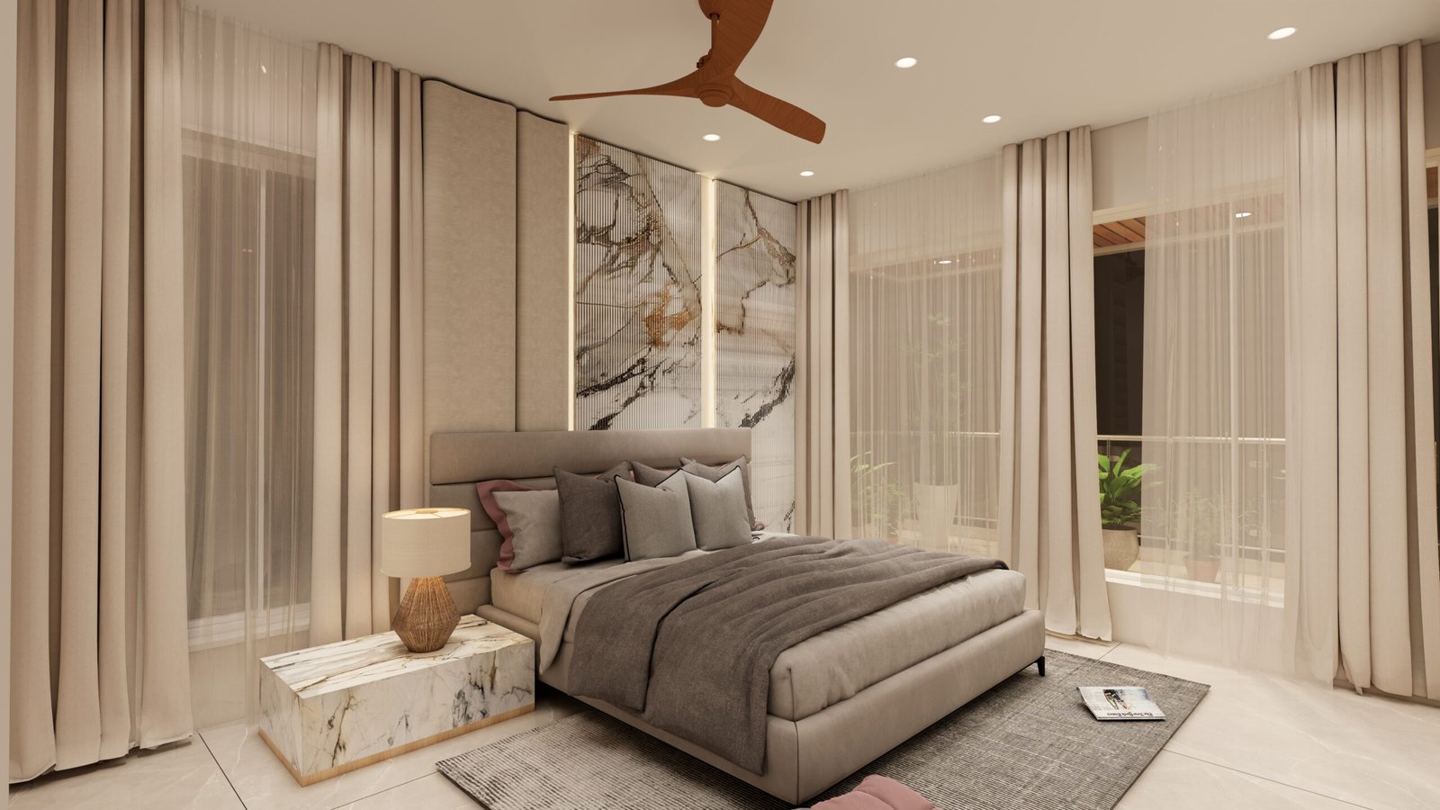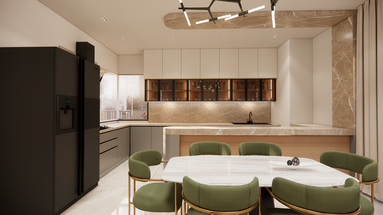 The living and dining spaces are thoughtfully planned with textured wall treatments, custom-built furniture, and subtle ceiling details that enhance depth and character. The kitchen features sleek cabinetry, marble finishes, and efficient space planning for seamless functionality.