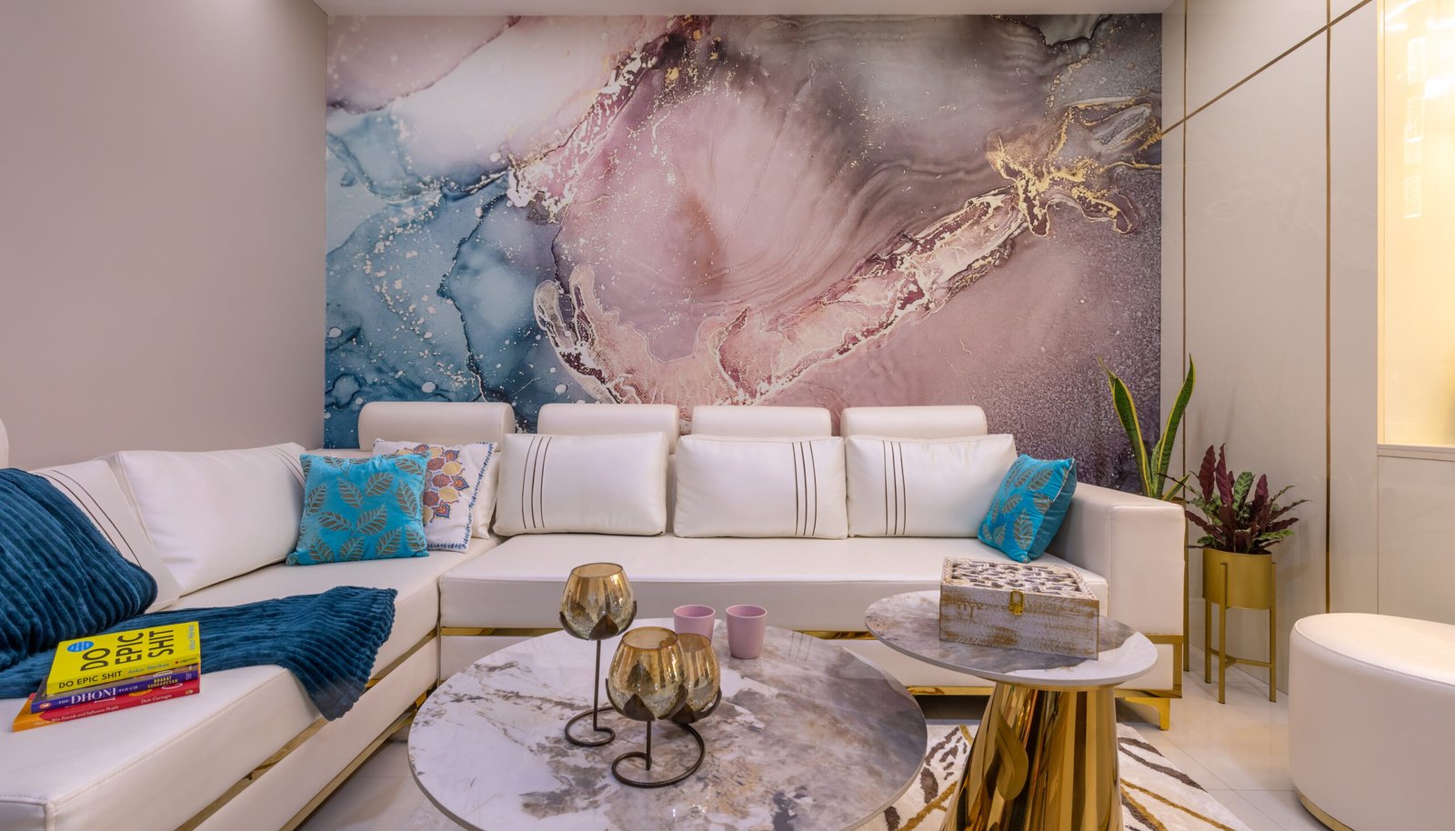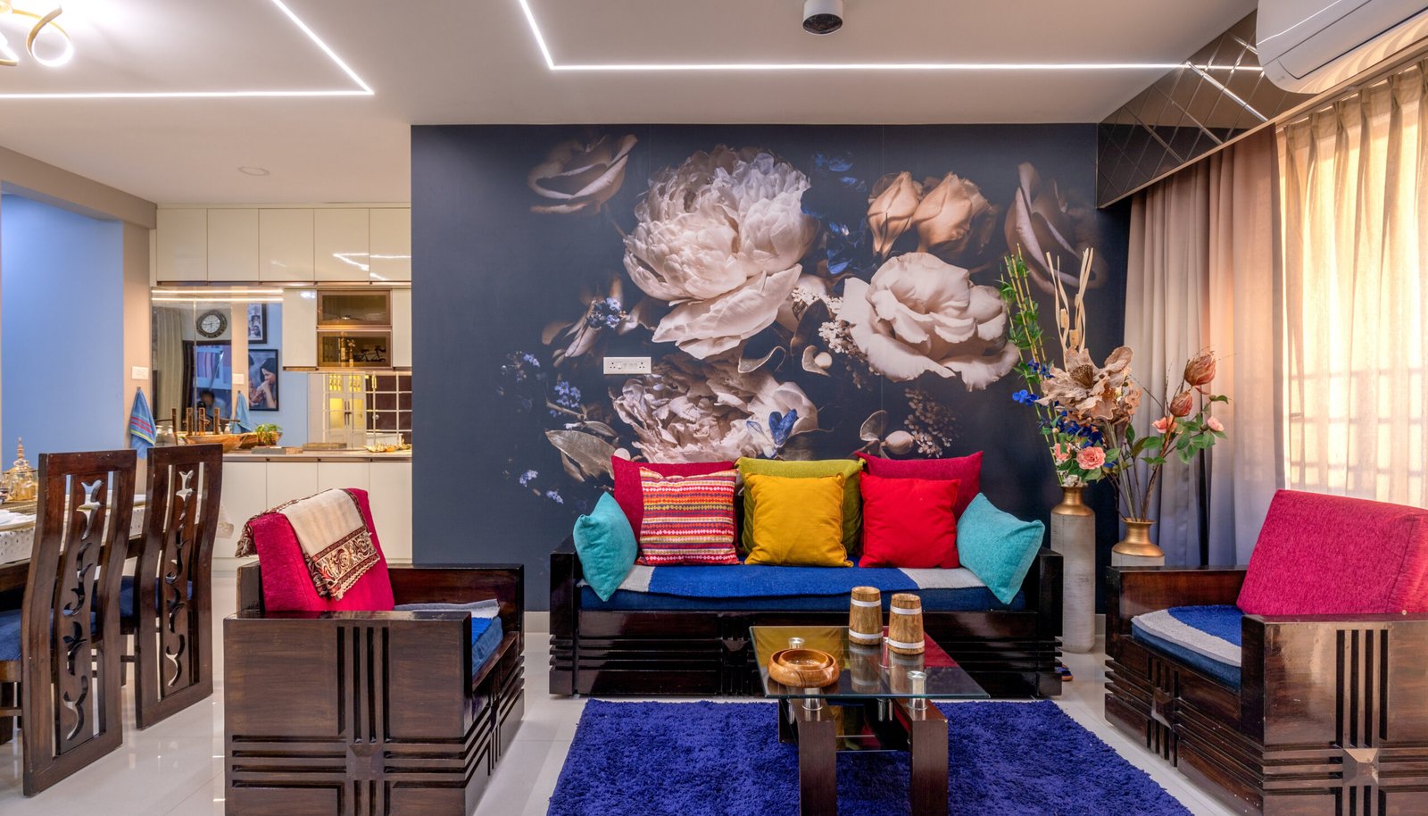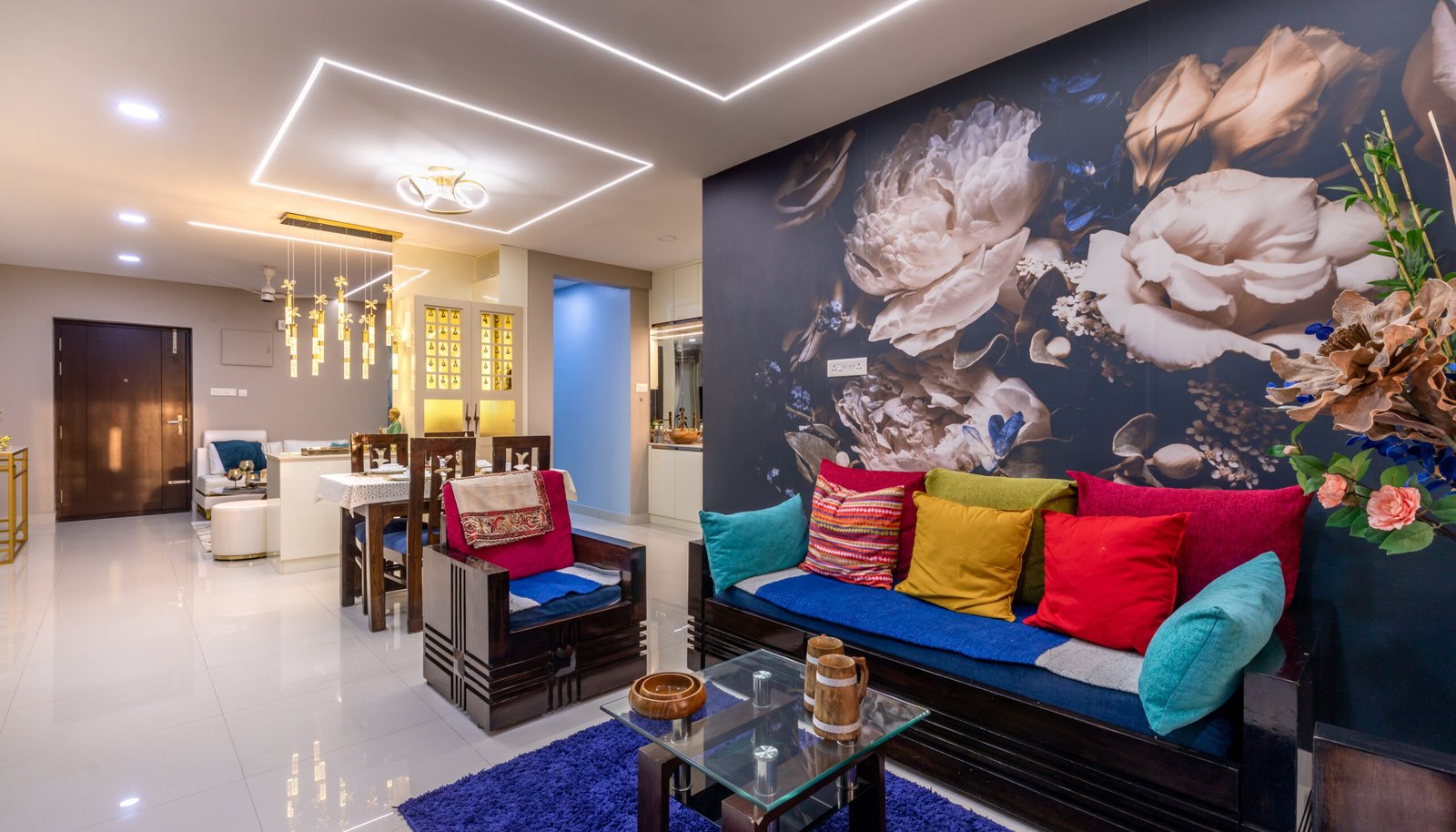 The living area features a striking abstract mural backdrop paired with a sleek white sectional sofa and gold-accented furniture. Layered lighting, marble-finish center tables, and curated décor elements enhance the luxurious yet playful aesthetic. A separate formal seating space showcases a dramatic floral mural wall, rich wooden furniture, and colorful upholstery, adding depth and character to the home.