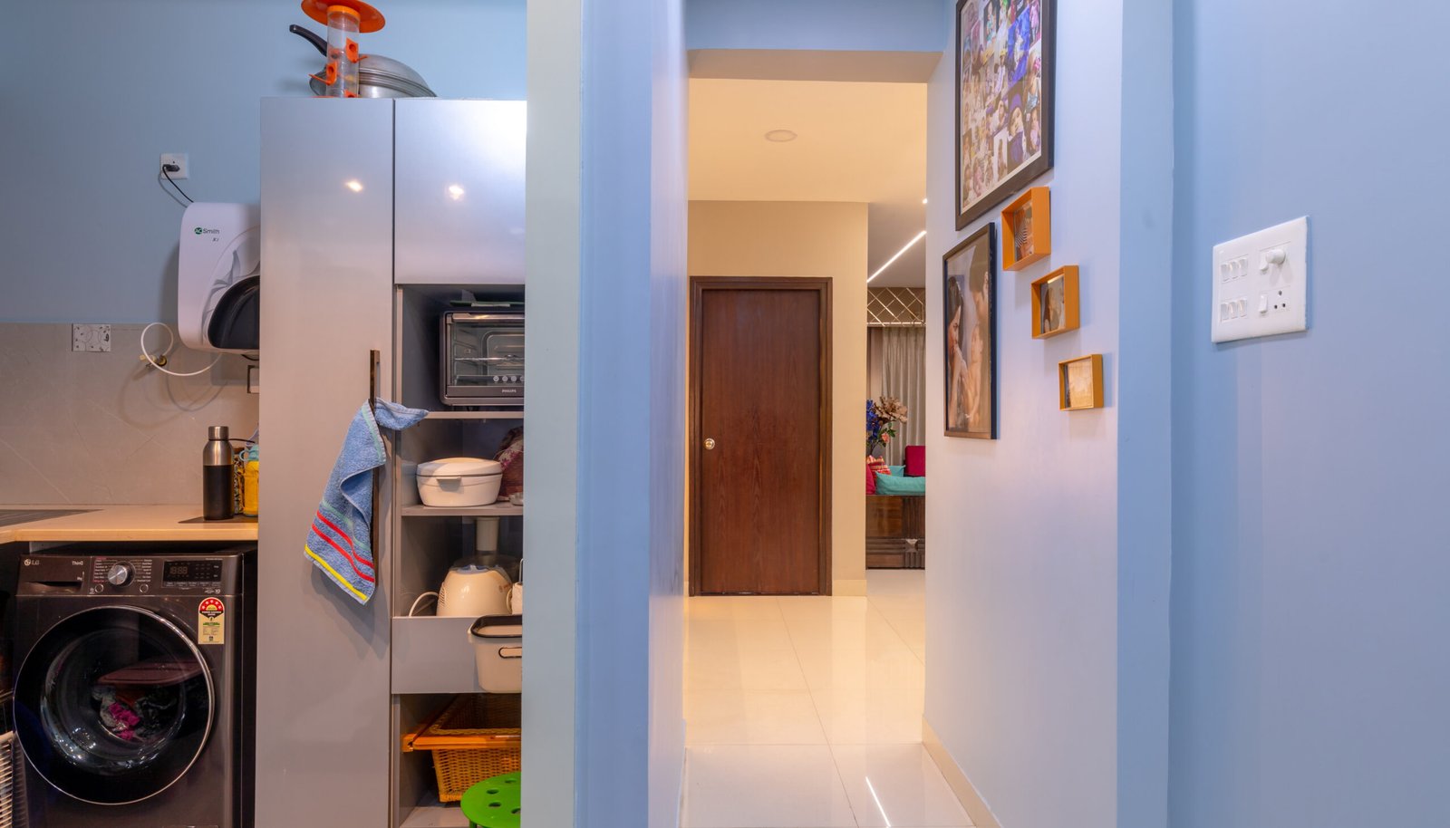 This 3BHK residence at Ramky One Galaxia, Nallagandla, is a vibrant and expressive home designed to reflect the personality and lifestyle of the family. The interiors blend bold artistic elements with functional planning, creating spaces that feel energetic yet comfortable.