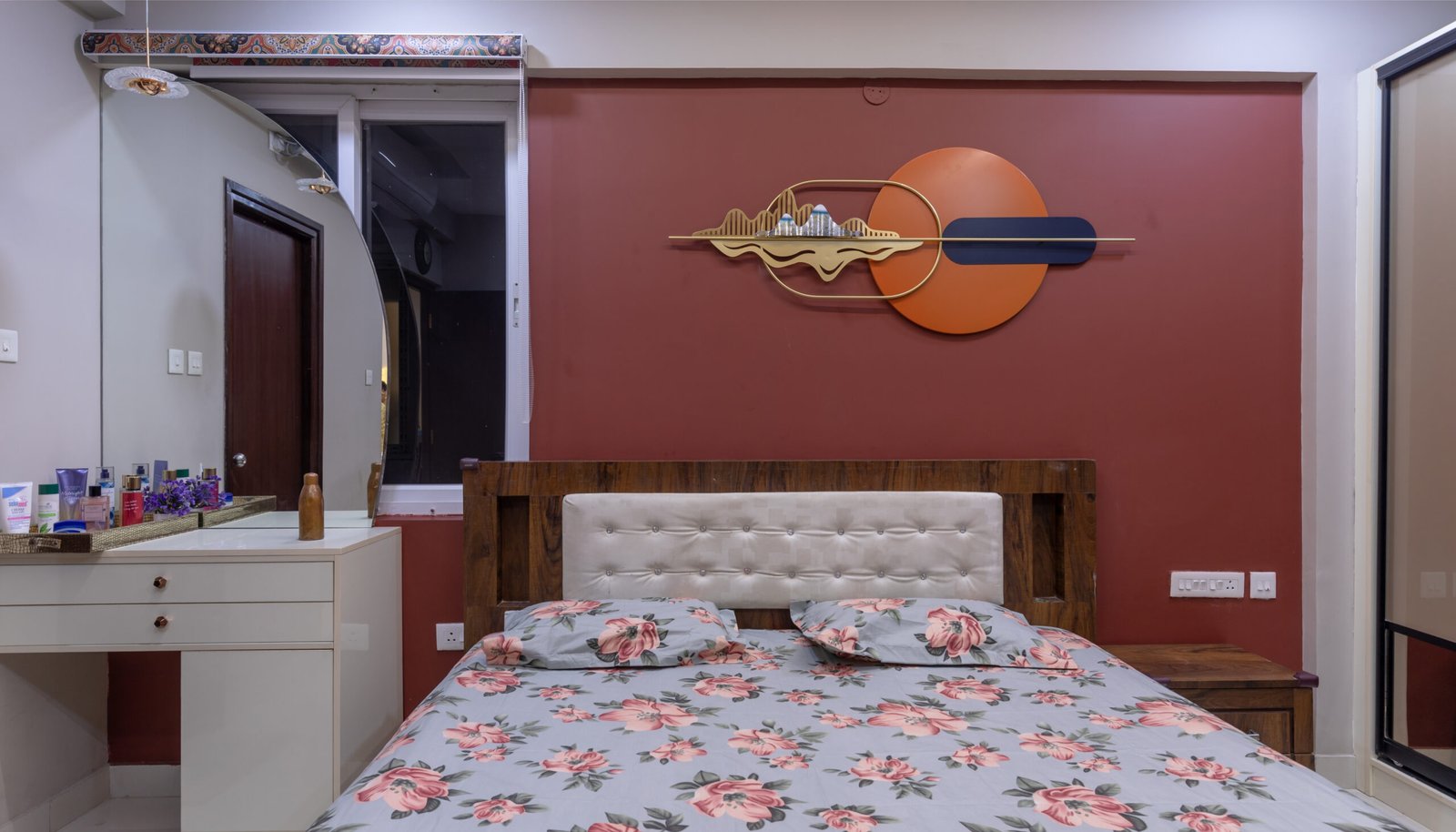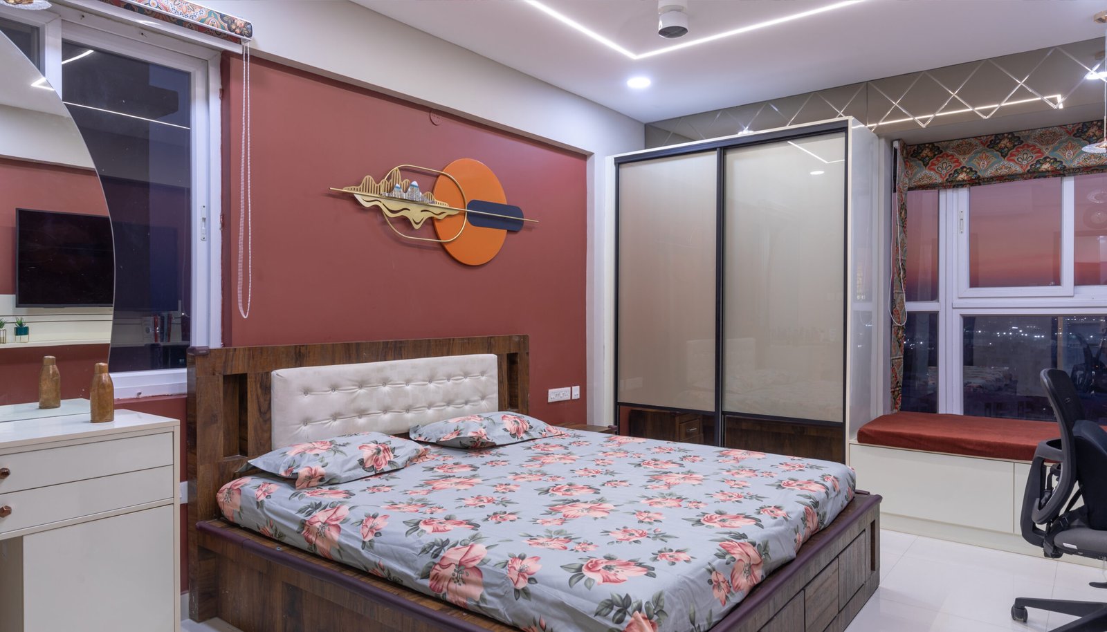 The master bedroom embraces warm earthy tones with a textured accent wall, sliding wardrobes, and integrated seating by the window for a cozy retreat ambiance.