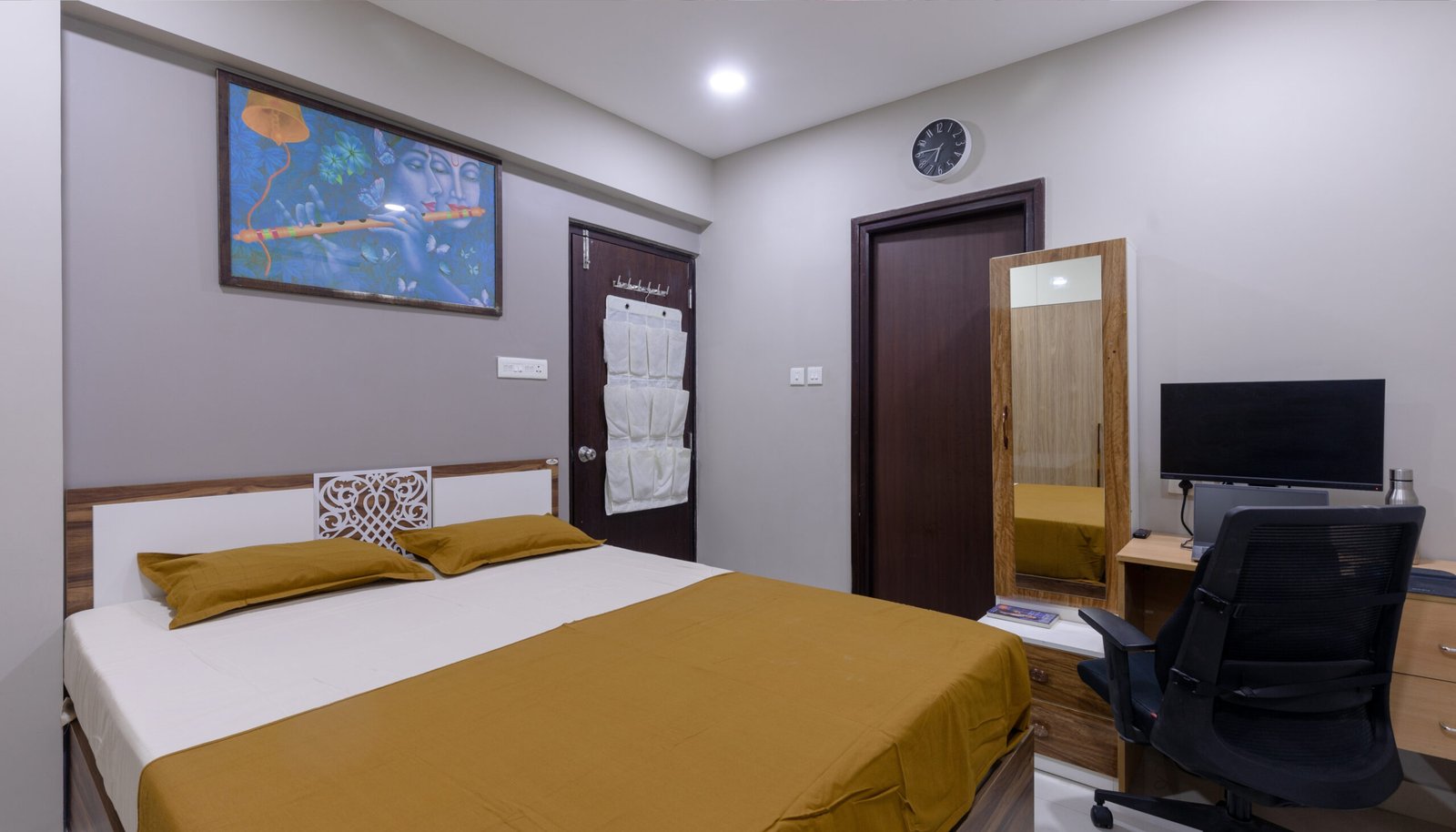 The guest bedroom is designed with a clean and minimal approach, combining wooden textures with soft neutral finishes to maintain simplicity and comfort.