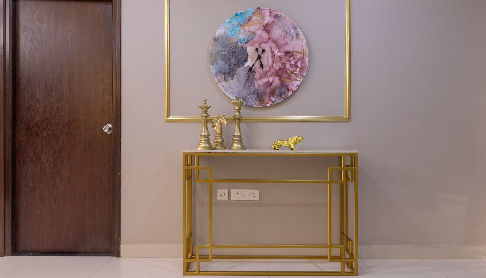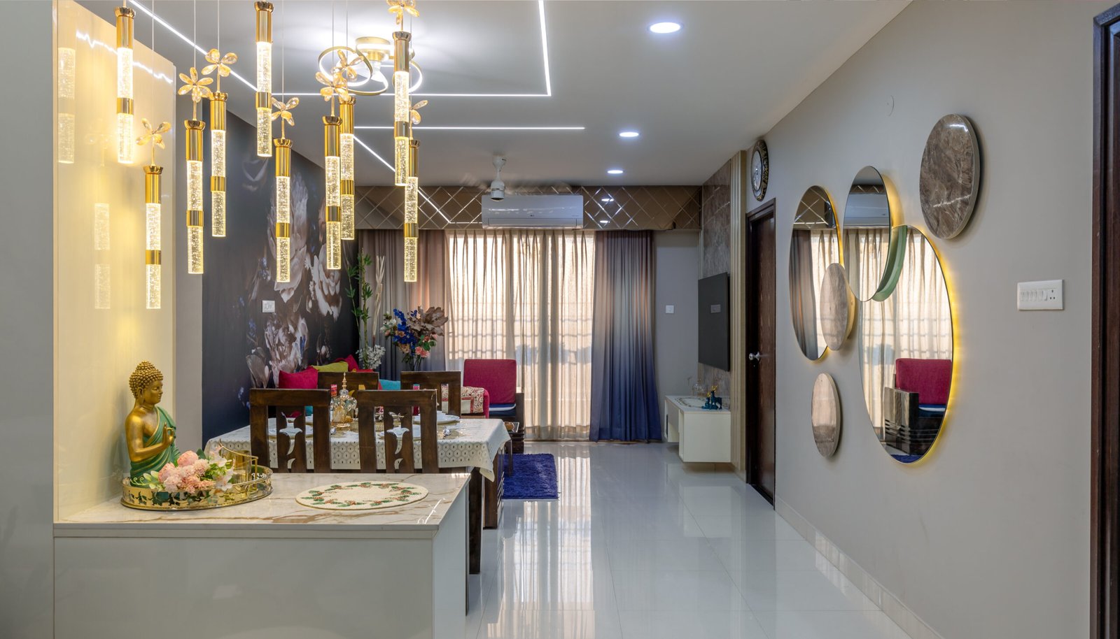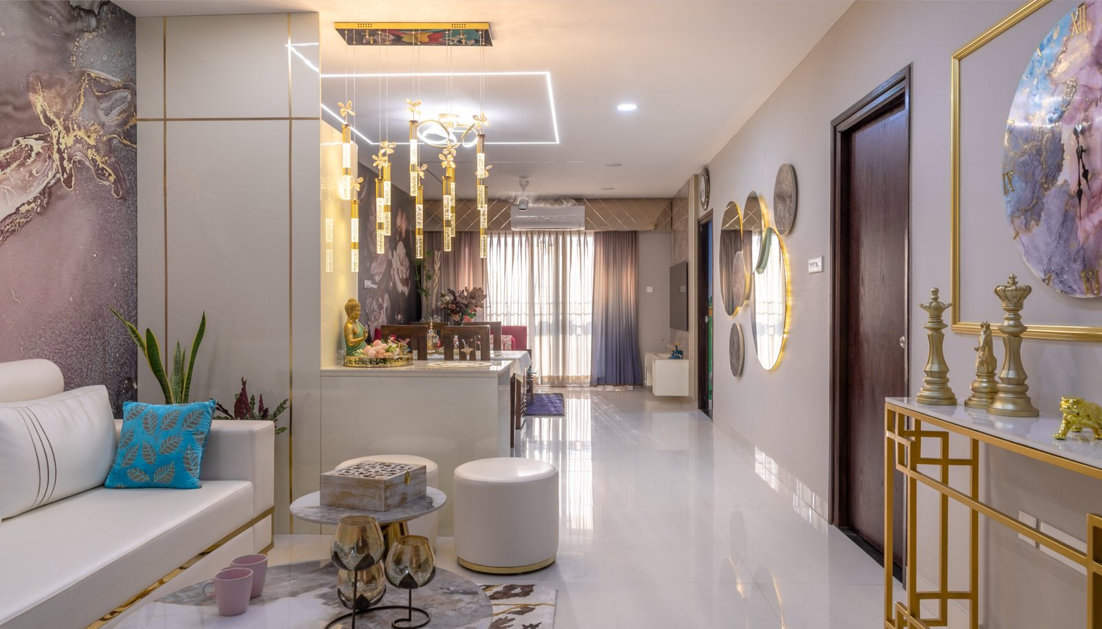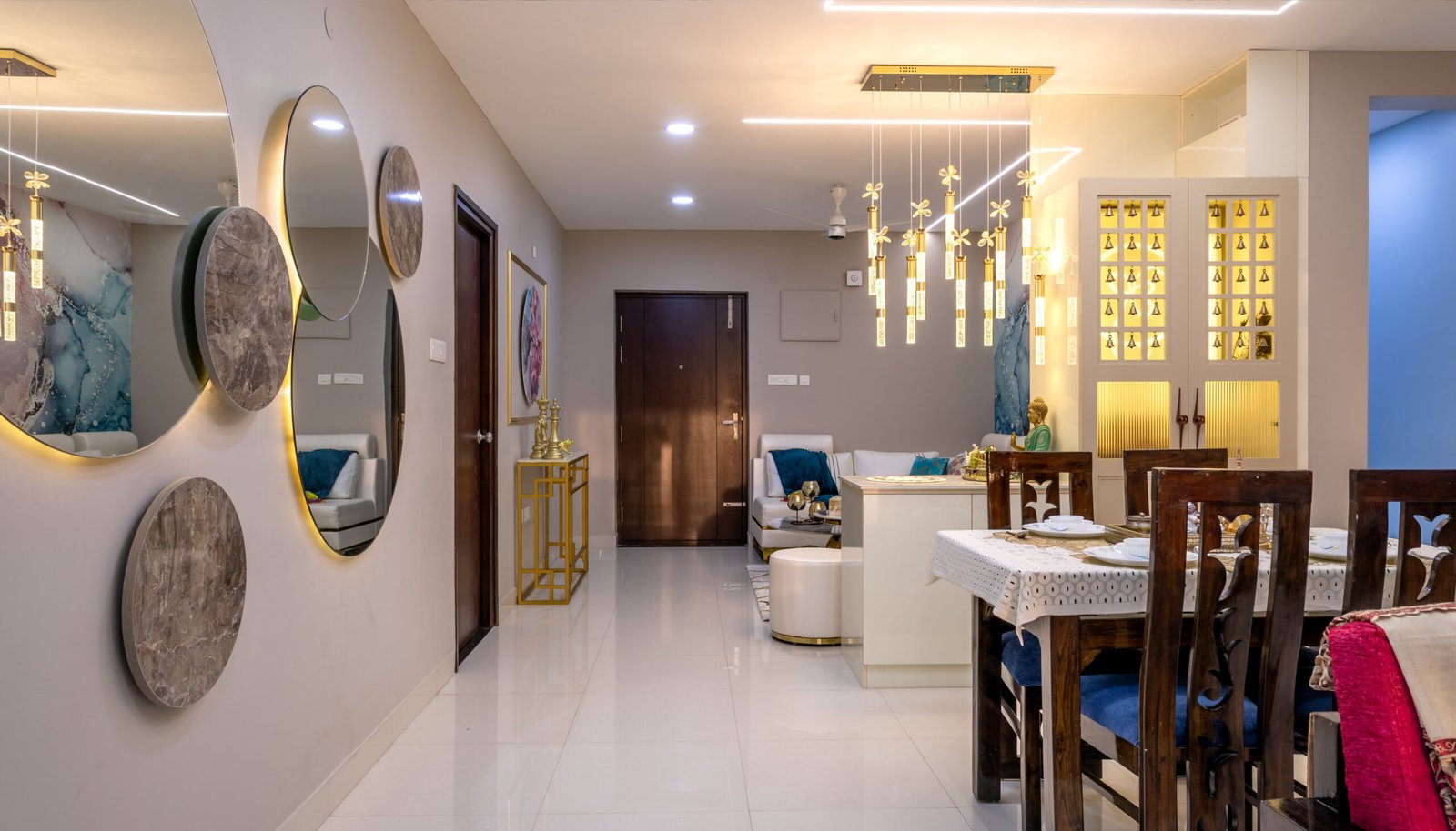 The foyer passage is thoughtfully designed with decorative mirrors, statement lighting, and elegant console styling, creating a grand visual transition into the main living space.