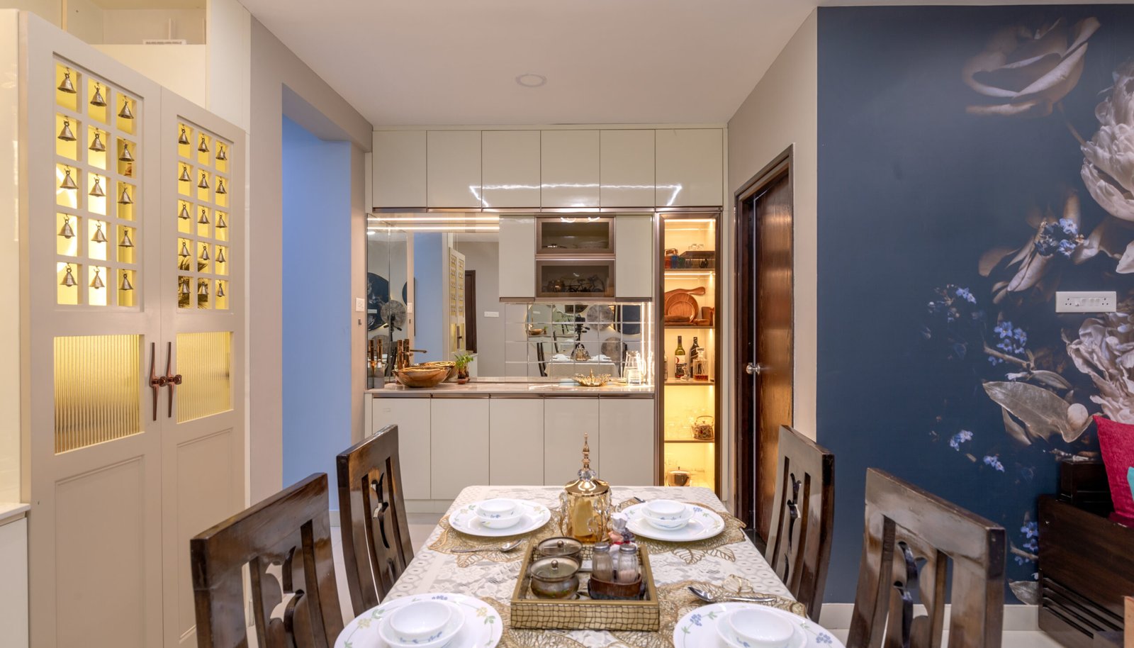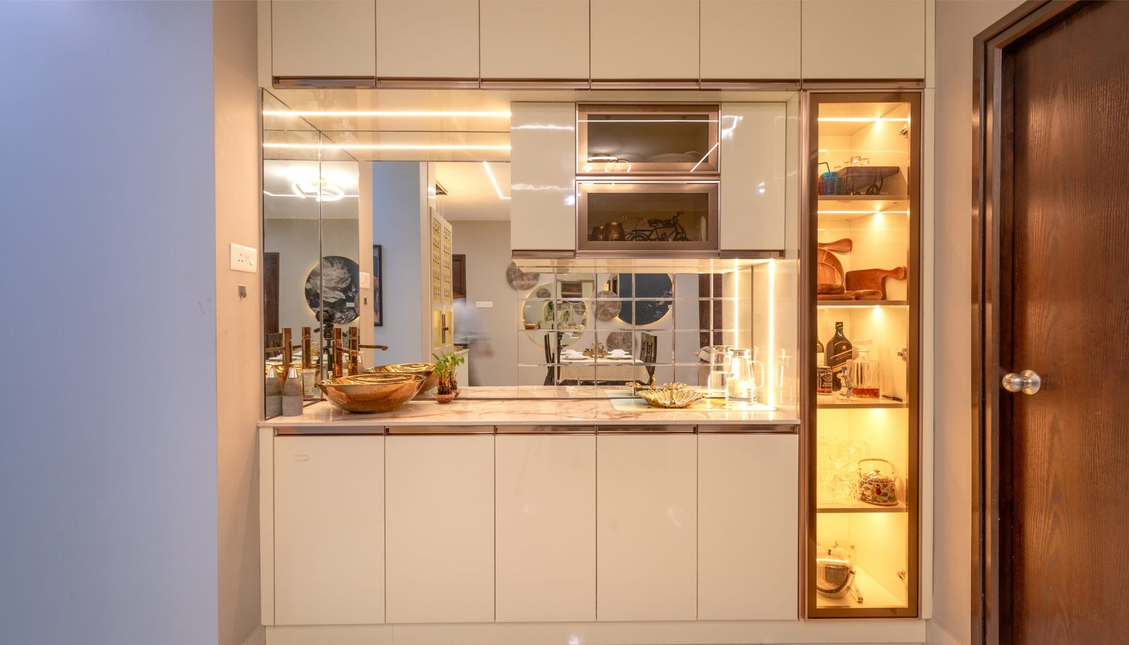 A stylish crockery/bar unit with backlit display shelves and mirrored panels adds sophistication while maximizing storage and functionality.